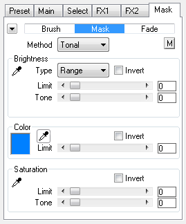 The Tonal method contains three options for creating masks based on brightness, color and saturation values of the image. You can use all three groups at the same time or only one. Each group contains an Invert slider, which makes masked areas unmasked and vice versa.