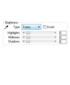 The Tones options of the Brightness group offers Highlights, Midtones and Shadows sliders. If you increase the value of the Highlights sliders, the ColorStyler effect will be removed from the bright image areas. If you additionally activate the Invert check box, the Highlights slider adds the ColorStyler effect to the bright image areas. The other two sliders work accordingly, but affect mid bright and dark image areas. Alternatively you can activate the eyedropper icon of this group, click on the preview, hold down the mouse button and drag the mouse over the preview. One of the three sliders is then automatically chosen (depending on the clicked pixel in the preview) and its value is changed during dragging.