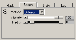 All three methods work similarly, but soften the image in slightly different ways. Diffusor creates a weaker softness while Fog produces a more flat and softer look. The Intensity slider controls the strength of the effect and the Radius slider controls its smoothness.