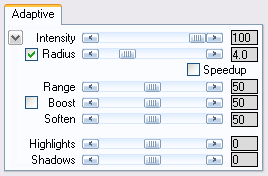 The Adaptive tab sheet controls the adaptive contrast effect. The adaptive contrast effect is not as dramatic as the dynamic contrast effect, but is nice for improving the contrast in textured areas. The Adaptive Contrast effect renders quite fast in a small preview, but needs overproportional longer for large images. Depending on the Radius value and your processor it can take up to several minutes on a 10 Megapixel image. To avoid that you can also try activating the Speedup check box.