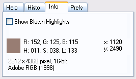 The two lines at the bottom of the Info tab sheet show the image size in pixel and the channel bit depth. The second line only appears in the Standalone/Lightroom version and names the color space of the image or shows "No Profile" if no profile was embedded in the image file.