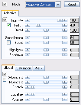 Adaptive Contrast mode lets you apply the adaptive contrast as well as global contrast effects. For more details, please read the Adaptive Tab Sheet, Global Tab Sheet, Saturation Tab Sheet and Mask Tab Sheet pages.