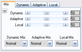 3. To display only the dynamic contrast effect choose "Dynamic Contrast" on the arrow-down button menu of the Mix tab sheet. Alternatively you can also set the Adaptive and Local sliders on the Mix tab sheet to zero. Switch to the Dynamic tab sheet and adjust the effect until you like it.