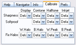 The Calibrate tab sheet can be used to adjust the intensity of the automatic sharpening and Softproof feature. Additionally you can chnage the default values of the sliders in the Halo group on the Fix tab sheet. Depending on which Workflow option you have selected, some options will not be visible on the Calibrate tab sheet.
