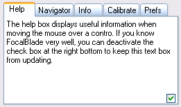 The Help sheet is located on the right bottom of the FocalBlade window. This feature was built in to make it easier for beginners to get started and makes it possible to use FocalBlade without a glance at the manual. If you move the mouse over a certain control, the text box will display some explanations and hints about the control.