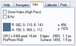The two lines at the left bottom of the Info tab sheet show the image size in pixel and the channel bit depth. The second line only appears in the Standalone/Lightroom version and names the color space of the image or shows "No Profile" if no profile was embedded in the image file.