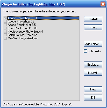 At the end of the installation process the Plugin Installer dialog will be shown with a list of compatible applications, which are installed on your computer. The application at the top of the list is always activated by default. If you want to install LightMachine into other applications, you should activate them, too. Then press the Install button to copy the LightMachine plugin into the plugin folder of the selected application(s). Finally leave Plugin Installer with the Exit button.