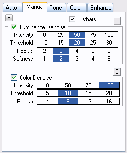 The Manual tab sheet contains the parameters that are used for noise reduction.