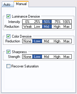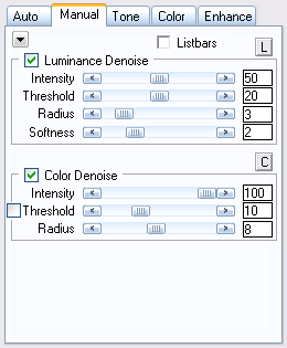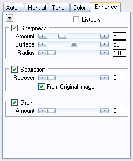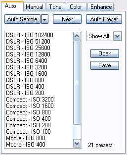 For more details, see the following pages: Auto Tab, Manual Tab , Tone Tab, Color Tab and Enhance Tab.