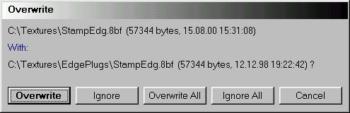 You have five different buttons to tell Plugin Commander what to do. Pressing the Overwrite button will overwrite the displayed file, pressing the Ignore button won't overwrite it. But in both cases the Overwrite dialog will appear again, if another file has to be overwritten. On the contrary the Overwrite All button will tell Plugin Commander to overwrite all files that still have to be processed and Ignore All won't overwrite any files. In both cases the Overwrite dialog won't appear again before all files are processed. Finally pressing the Cancel button will abort the whole operation and stop all file processing.