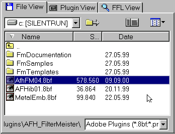 Double clicking a Filter Factory plugin will load it into the FF Editor, double clicking other Photoshop-compatible plugins will execute them. Double clicking an image will display it in the Picture Editor. If the Preview icon is active and you click on a plugin, PSP add-on or image, you will see a preview of it in the Preview window. Double clicking other files will launch the associated application. Right clicking on a file will display the Commands context menu, whereas right clicking on a folder or clicking on the folder label will display the Folders context menu.