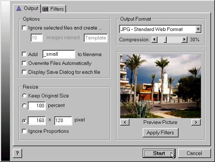 This dialog enables you to change the format, size or color depth and apply filters to a large number of images with one click. You can use it to automatically apply selected Filter Factory plugins to the default preview image. You can also create thumbnails of Filter Factory plugins by using the Resize option. Finally you can also create random textures.
