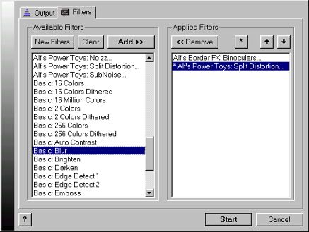This frame contains some built-in filter which start with "Basic:" and lets you add Filter Factory plugins to the list. To add them press the New Filters button and select a folder with Filter Factory plugins. To remove all added Filter Factor filters simply click the Clear button. To add a filter to the Applied Filters list select one from the Available Filters list box and press the Add >> button or simply double click the filter. It will then be displayed in the Applied Filters list box to the right.