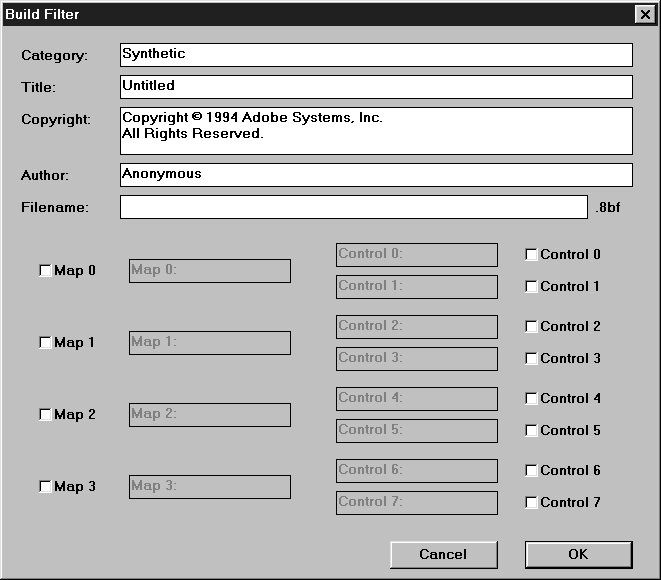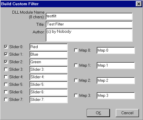 In this window you can enter the file name of the compiled .prm file (Premiere PlugIn), the name that will appear in the Filter dialogbox and a note about the author and copyright. Below it you can select which sliders or maps are to be displayed in the compiled filter.