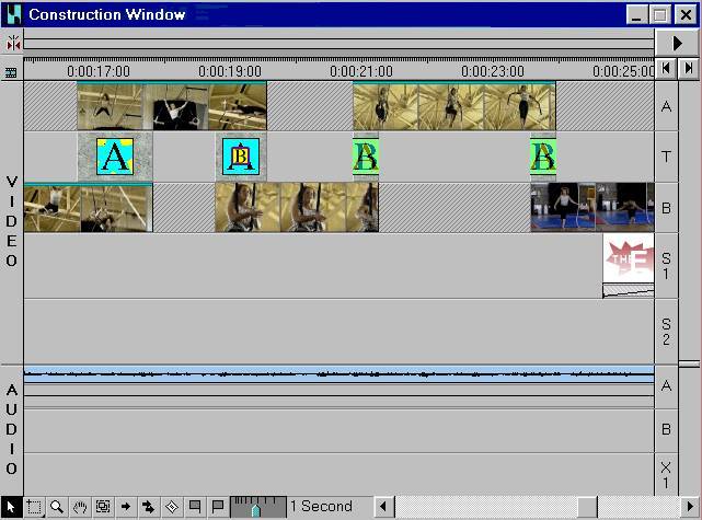 The first track of the Construction Window, the A-Track, is intended for the first video sequence, the second is the T-Track where the Transitions are placed and the third, the B-Track, is for the video sequence that follows. Below them there are up to 99 S-Tracks where titles oder other videos can be placed for overlaying the videos on Track A and B. Last but not least there are up to 99 Audio-Tracks for placing the sound of Video A und B and mixing them with background music. (Premiere can also be used for multitrack sound mixing, although it doesn't offer the comfort of Samplitude Studio, Cubase VST, Cool Edit Pro etc.)