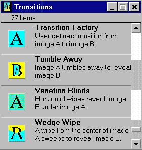Transition Factory is used almost exactly as Filter Factory. The Transition Factory has to be dragged from the Transitions window to the T-Track to make the Transition Factory Settings window appear. Further differences are that you can enter a description of the transition in the Build window and that it is placed in the Transitions window showing a preview of its effect (as you can see in the third picture above!).