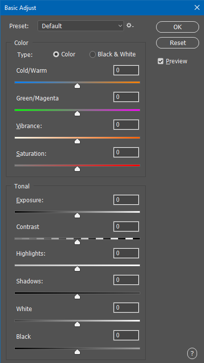 The Basic Adjust feature offers a combination of often needed color and brightness adjustment options, so it is a general purpose tool. You can also use it to create a black & white effect with the Type radio buttons at the top.