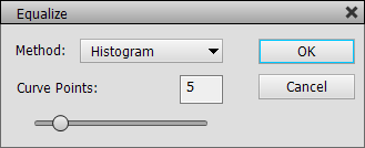 The Histogram method creates a equalization curve by using the full histogram. The number of created curve points is determined by the Curve Points slider. The more curve points are added the more precise is the effect, but less curve points often produce a more pleasing effect. The Brightness method adds one additional curve point that increases or decreases the brightness. The Contrast and Tonal Range effect add three curve points that equalize the contrast or tonal range of the image. The Simple method is similar to the Histogram method, but only adds three curve points.