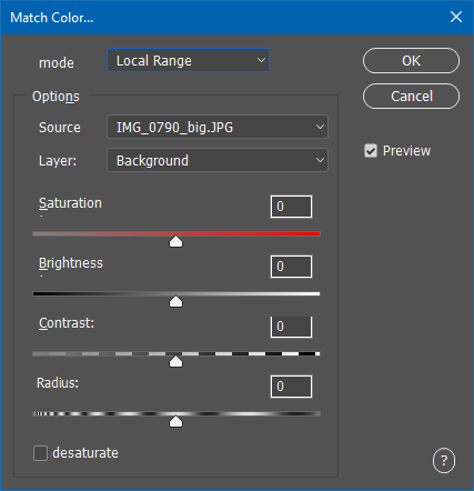 There are two effects selectable from the Mode combo box. The Global Light effect takes the average color of the other image or layer to uniformly colorize the current image. The Local Range effect grabs colors from various areas of the other image thus colorizing the current image differently in various places. The Desaturate check box makes sure that the currently selected layer is only adjusted in brightness and not color. The Saturation slider controls the saturation of the color effect. The Brightness and Contrast sliders let you adjust the effect to the brightness and contrast of the source image or layer. The Radius slider determines the size of the areas from which colors are grabbed by the Local Range effect.