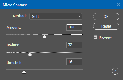 The Threshold slider is generally similar to the Amount slider but also increases the number and size of image details that will be amplified. For the Soft method it additionally amplifies the intensity of the contours in the image. For the Grainy method larger slider values also make the effect a bit softer.