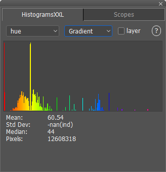 The Scopes panels shows 23 different types of scopes (first combo box) in a negative or positive style (second combo box). Only the RGB, CMYK, HSL and YCbCr color models are used for calculating the scopes. So there is no Lab scope available (see the HistogramsXXL panel), because it would be too time consuming and the YCbCr color model provides a very similar scope.