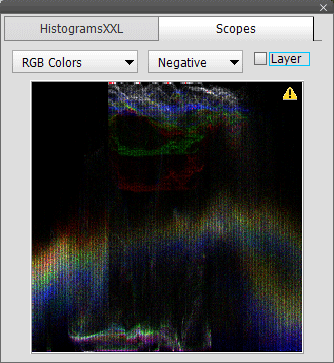 Again as with the HistogramsXXL panel you can activate the Layer check box in order to only see the scope of the current layer instead of the whole image. To see only the scope of a certain image area you can create a selection. An exclamation mark symbol appears in the top right corner. Click it to use the full sized image to calculate the scopes. This is normally not done to avoid slowing down Photoshop (Elements).