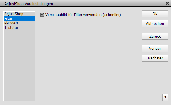 Wenn Sie diesen Menüpunkt im Voreinstellungen-Untermenü klicken, wird ein Dialogfenster geöffnet, mit dem Sie die Einstellungen von AdjustShop ändern können. Sie können zwischen verschiedenen Einstellungsgruppen wählen, indem Sie die Liste rechts verwenden oder Voriger und Nächster anklicken. Um alle Optionen auf die vorherigen Ausgangseinstellungen zurück zu setzen, klicken Sie auf die Zurück-Schaltfläche. Drücken Sie OK, um die Änderungen anzuwenden oder auf Abbrechen, um sie für ungültig zu erklären.