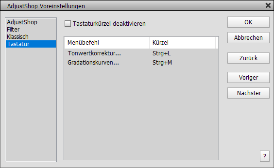 Das Kästchen Tastaturkürzel deaktivieren deaktiviert (und reaktiviert) die Tastaturkürzel von AdjustShop. Alle aktuell verfügbaren Tastaturkürzel werden in der Liste darunter angezeigt.