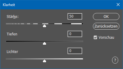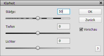 Der Klarheitfilter reproduziert den Effekt, der aus Adobe Camera Raw. Er erhöht den Kontrast in kleinen Bildbdetails, tut dies jedoch subtiler als der Mikro-Kontrast-Effekt. Der Stärke-Regler legt die Intensität des Effekts fest. Mit den Tiefen- und Lichter-Reglern können Sie den Klarheiteffekt in den dunklen und hellen Bildbereichen verringern oder verstärken.