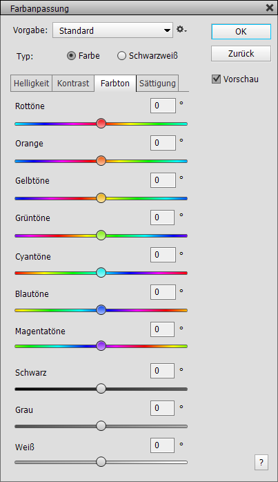 Die Farbanpassung-Funktion ist ein sehr leistungsfähiges Werkzeug, welches Ihnen ermöglicht, sehr spezielle Bildbereiche anzupassen. Eine unsichtbare Maske wird automatisch für jeden der zehn Regler genutzt. Sie können die die Helligkeit, den Kontrast, den Farbton und die Sättigung der roten, orangefarbenen, gelben, grünen, cyanfarbenen, blauen, grauen und weißen Bildbereiche anpassen. Sie können ebenso einen ausgeklügelten vollständigen oder teilweisen Schwarzweißeffekt erstellen, wenn Sie oben die Option "Schwarzweiß" anklicken.