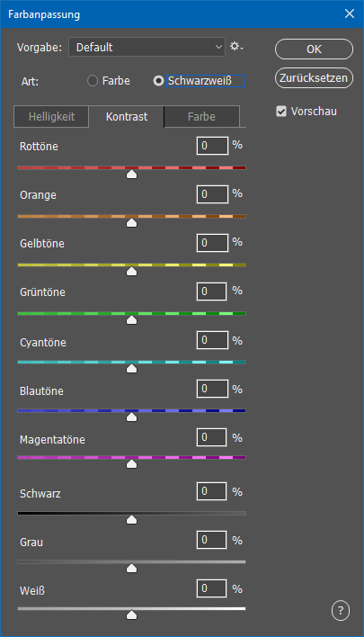 Als Ausgangseinstellung ist der Effektart Farbe ausgewählt, was im Grunde bedeutet, dass das Bild nicht verändert wird, wenn alle Regler einen Wert von Null besitzen. Sie erzielen nur einen Effekt, wenn Sie einen Regler anpassen. Wenn sie den Effektart Schwarzweiß wählen wird ein Standard-Schwarzweißeffekt angewendet, der mit den Reglern noch weiter verfeinert werden kann.