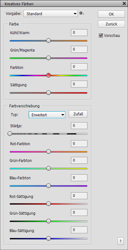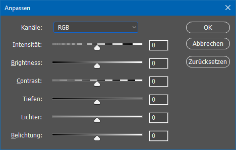 Um die Reglerwerte auf Null zurück zu setzen, können Sie auf die Schaltfläche "Reset" klicken. Auch die Schaltfläche "Abbrechen" macht die Anpassungen rückgängig, aber schließt den Dialog. Die Schaltfläche "OK" behält die Anpassungen bei.
