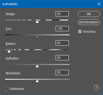 Das Kästchen Umkehren dreht den Effekt um, d.h. dunkle Bereiche werden abgedunkelt und helle Bereiche werden aufgehellt. Dies kann dazu verwendet werden, einen Rücklichteffekt zu erstellen.
