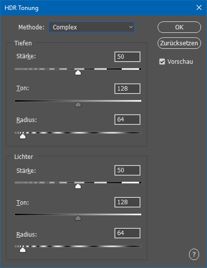 HDR Tonung ermöglicht, die Tiefen- und Lichtertöne zu komprimieren, um einen HDR-ähnliches Aussehen zu produzieren. Dieser Filter ähnelt dem Tiefen/Lichter-Dialog, erzielt aber einen natürlicher wirkenden Effekt. Die Einfach-Modus bietet weniger Regler und wird schneller berechnet als der Komplex-Modus, welcher mehr Regler für separate Tiefen- und Lichteranpassungen bietet. Beide Modi verwenden individuelle Reglerwerte, somit werden beim Wechsel zum anderen Modus nicht die Reglerwerte des vorhergehenden Modus übernommen.