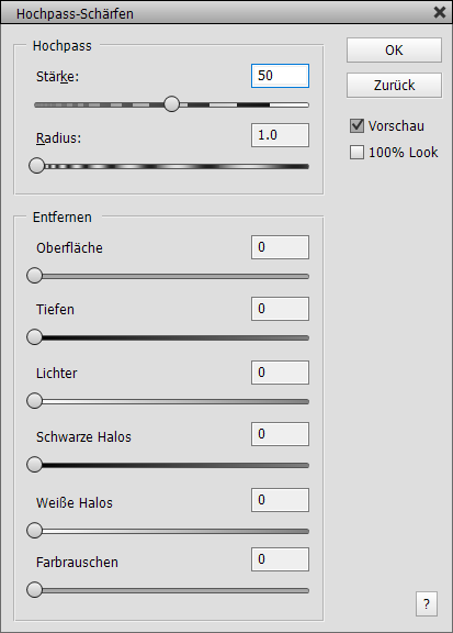 Das Kästchen 100% Look erlaubt es, den Schärfeneffekt bei 100% Zoom zu betrachten. Falls ein Vorschaubild verwendet wird, wird die Vorschaufunktion deaktiviert und das Berechnen des Effekts könnte länger dauern.