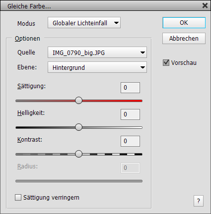 Zwei verschiedene Effekte sind im Modus-Kombinationsfeld wählbar. Der Effekt Globales Licht nimmt die Durchschnittsfarbe eines anderen Bildes, um das aktuelle Bild einheitlich einzufärben. Der Effekt Lokaler Bereich greift sich Farben aus verschiedene Bereichen des anderen Bildes wodurch das Bild lokal unterschiedlich gefärbt wird. Das Kästchen Sättigung verringern bewirkt, dass das Bild nur in der Helligkeit verändert wird, und nicht farblich. Der Sättigung-Regler beeinflusst die Sättigung des Farbeffekts. Mit den Helligkeit- und Kontrast-Reglern können Sie den Effekt an die Helligkeit und den Kontrast des Quellbildes oder der -ebene anpassen. Der Radius-Regler bestimmt die Größe der Bereiche, aus denen die Farben für den Lokalen Bereich Effekt aufgenommen werden.