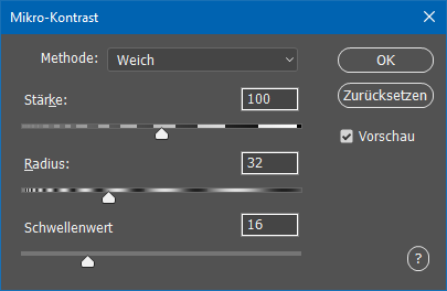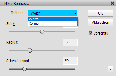 Der Mikro-Kontrast filter verstärkt Strukturen in kleineren oder größeren Bilddetails. Es gibt zwei Methoden: Weich produziert einen safteren Effekt während Körnig einen rauheren Oberflächeneffekt erzeugt. Bitte beachten Sie, dass der Körnig-Effekt nur für Bilder mit 8-bit pro Kanal zur Verfügung steht und dass der Weich-Effekt für Bilder mit 16-bit pro Kanal viel langsamer berechnet wird.