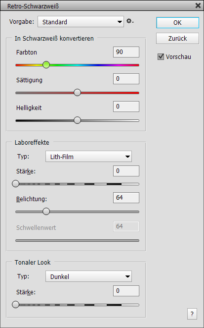 Die Regler in der In-Schwarzweiß-konvertieren-Gruppe legen den Farbfilter für die Schwarzweißkonvertierung fest. Mit dem Farbtonregler wählen Sie die Farbe des Konvertierungsfilters. Wenn Sie sich beispielsweise für eine rote Farbe entscheiden, werden die roten Bereiche des Farbbildes im Schwarzweißbild hell. Da Cyan die Komplementärfarbe zu rot ist, werden die cyanfarbenen Bereiche dunkel. Alle anderen Bereiche haben dann mittelgraue Töne. Der Sättigung-Regler beeinflusst den Kontrast des Schwarzweißlooks und der Helligkeit-Regler passt die Helligkeit an.