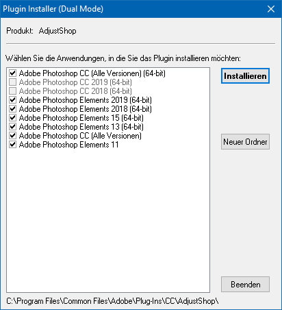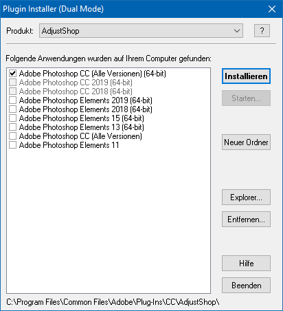 Wenn Sie eine neue Version von Photoshop Elements installieren und AdjustShop bereits installiert ist, müssen Sie nicht mehr das komplette Installationsprozedere von AdjustShop durchführen. Sie können Plugin Installer vom Startmenü aus starten und es verwenden, um AdjustShop in die neue Version von Photoshop Elements zu installieren.