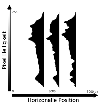 Die Scope-Achse von unten nach oben repräsentiert Pixelwerte von 0 bis 255 (oder 0 bis 32768 bei16-bit/Kanal-Bildern). Somit werden die Pixelwerte mit niedriger Helligkeit im unteren Bereich des Scopes, wohingegen die Pixelwerte mit hohen Helligkeit oben dargestellt werden. Je heller ein Pixel im Scope, desto mehr Pixel dieses Werts gibt es im Bild. Ein dunkler Punkt unten im Scope bedeutet damit, dass nicht viele dunkle Pixel im Bild (auf dieser horizontalen Position) existieren. Ein heller Punkt unten im Scope bedeutet, dass viele dunkle Pixel im Bild (auf dieser horizontalen Position) existieren. Befindet sich jedoch ein weißer Punkt oben, heißt dies, dass es viele helle Pixel (auf dieser horizontalen Position) gibt. Folglich bedeutet ein heller Bereich in der Mitte der vertikalen Achse, dass das Bild viele mittelgraue Pixelwerte aufweist.