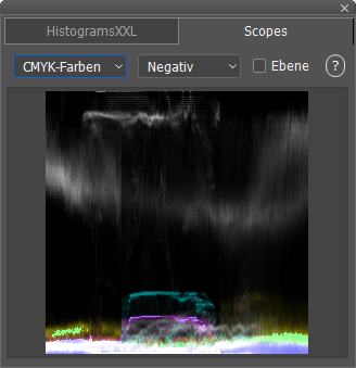 Das Scopes-Bedienfeld zeigt 23 verschiedene Arten von Scopse (wählbar aus dem erstes Kombinationsfeld) in negativem oder positivem Stil (zweites Kombinationsfeld). Nur die Farbmodelle RGB, CMYK, HSL und YCbCr werden zum Berechnen der Scopes verwendet. Es steht kein Lab-Scope (siehe HistogramsXXL-Bedienfeld) zur Verfügung, da dessen Berechnung zu zeitaufwändig wäre und das YCbCr-Farbmodel ein sehr ähnliches Scope bietet.