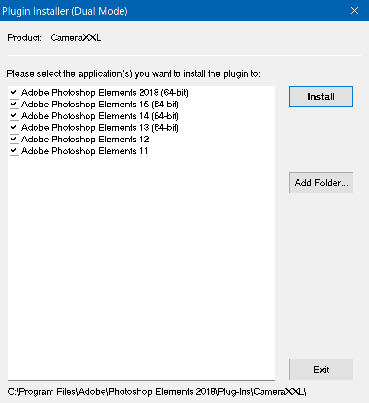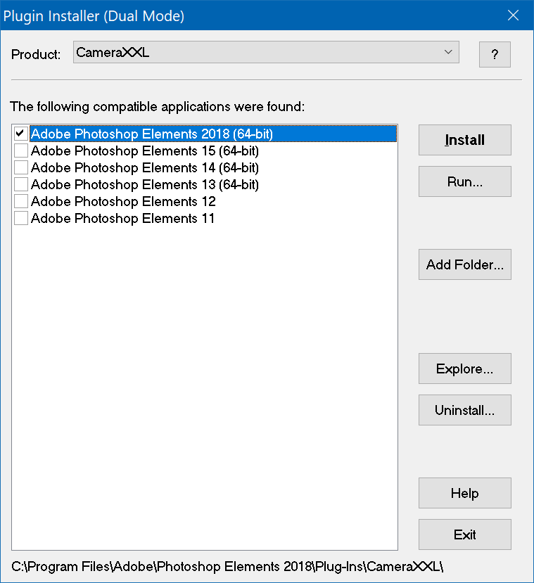 If you install a new version of Photoshop Elements and CameraXXL is already installed, you do not need to run the full CameraXXL installation again. You can run Plugin Installer from the Start menu and use it to install CameraXXL into the newly installed version of Photoshop Elements.