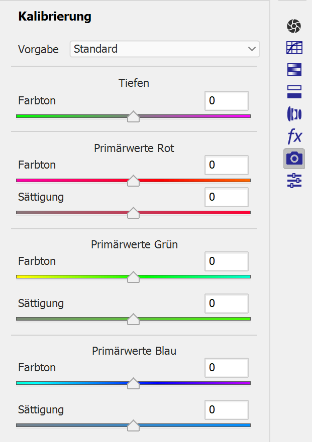 Einzelne Kameras produzieren eventuell leicht veränderte Farben im Vergleich zu einer durchschnittlichen Kamera des selben Modells. Somit können Sie Ihr eigenes Kameraprofil erstellen, indem Sie ein Farbprüfer-Diagramm fotografieren und Adobe DNG Profile Editor verwenden, um ein Kameraprofil zu speichern, welches dann aus dem Name-Kombinationsfeld oben ausgewählt werden kann. Die einfachere, jedoch weniger präzise Lösung wäre das manuelle Anpassen dieser sieben Regler, sofern Sie über ein gutes Auge für Farben verfügen. Alternativ können Sie diese Regler auch auf kreative Weise für Farbeffekte nutzen.