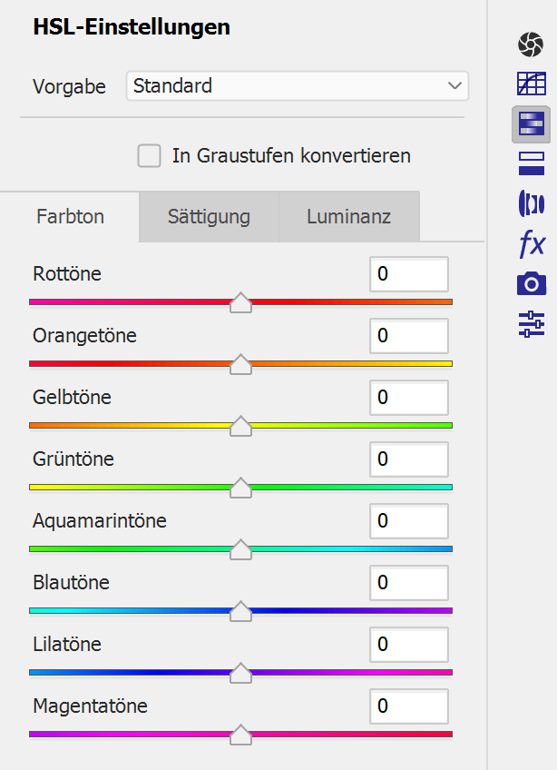 Wenn das Kästchen "In Graustufen konvertieren" nicht aktiviert ist, können Sie Farbton-, Sättigung- und Luminanz-Registerkarten sehen, andernfalls erscheint eine Graustufen-Registerkarte und das Bild wird in Schwarzweiß konvertiert. Jede der vier Registerkarten enthält acht Regler mit den selben Namen. Der Wert jedes Reglers geht von -100 bis 100.