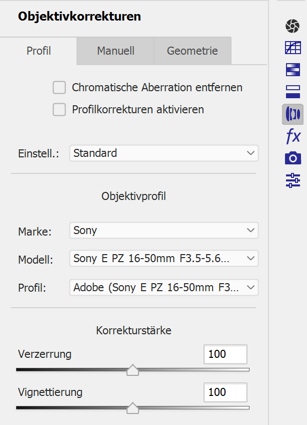 Die Objektivkorrekturen-Karte enthält automatische und manuelle