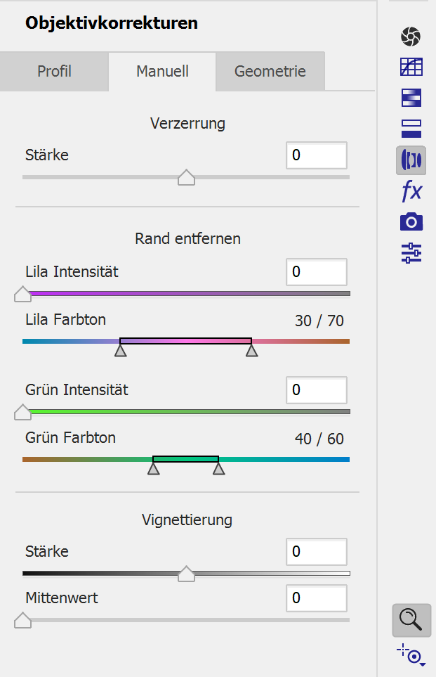 Die Unterregisterkarte "Manuell" bietet Steuerelemente zum weiteren Anpassen der automatischen Objektivkorrektur. Diese Funktionen sind auch anwendbar, wenn Sie die automatische Objektivkorrektur (sowie das Kästchen für das Entfernen von chromatischer Aberration in der Profil-Registerkarte) komplett deaktiviert haben oder kein passendes Objektivprofil verfügbar ist.
