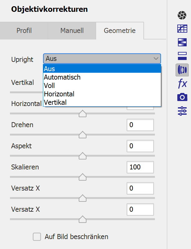 Die Geometrie-Registerkarte bietet Funktionen zum perspektivischen Editieren von Fotos. Das Upright-Kombinationsfeld enthält Optionen zum automatischen Korrigieren von verzerrten Objektlinien in Fotos. Die Aus-Option deaktiviert die automatische Korrektur. Die Auto-Option führt alle verfügbaren automatischen Korrekturmethoden aus. Mit der Voll-Option werden vertikale und horizontale Linien gerade dargestellt, während mit den Optionen "Horizontal" und "Vertikal" nur horizontale oder vertikale Linien begradigt werden.
