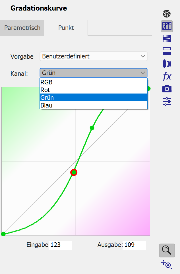 Die Punkt-Registerkarte bietet ein vollfunktionsfähiges Kurvendiagramm zum Erstellen eigener Kurven für die RGB-, die Rot-, Grün- und Blau-Kanäle des Bildes. Sie können bis zu vier Kurven gestalten, eine für jeden der Kanäle. Der RGB-Kanal ändert die Helligkeit des Bildes, wohingegen die anderen Kanalkurven die Farbe ändern. Das Kanal-Kombinationsfeld ermöglicht Ihnen, zwischen diesen vier Kanälen hin- und herzuwechseln.