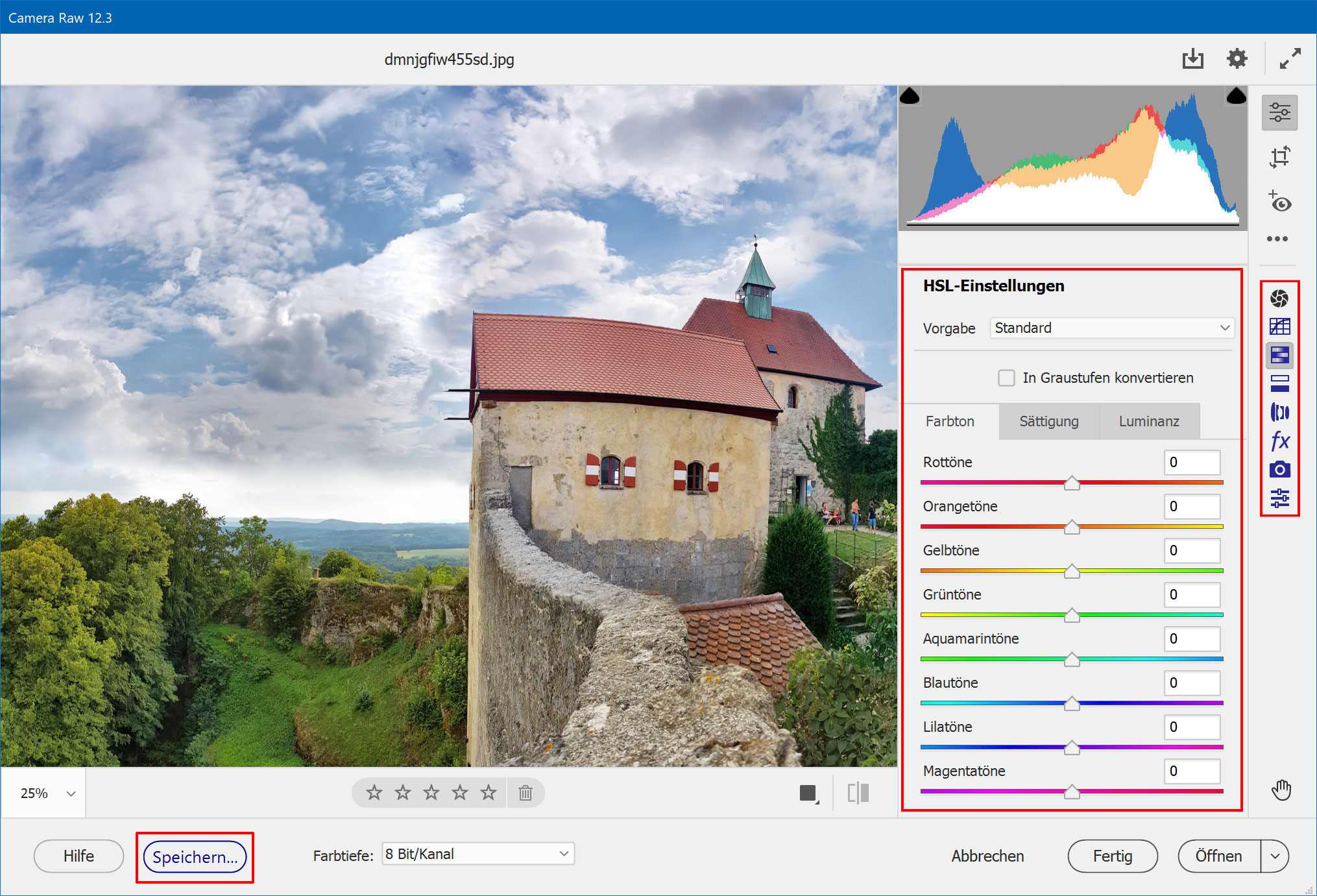 Die CameraXXL Icons befinden sich am rechten Rand in Adobe Camera Raw 12.3 (und höher)