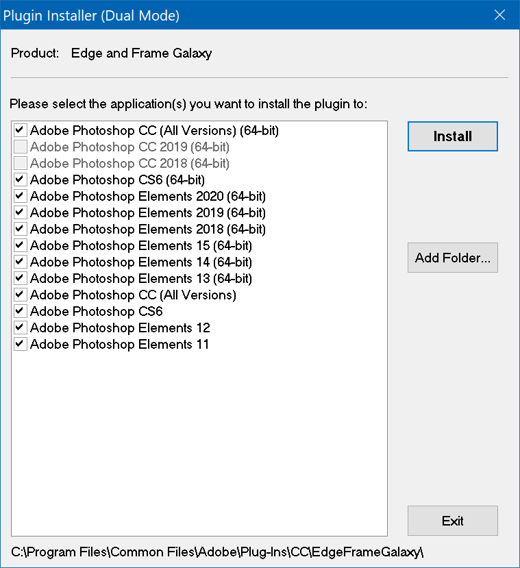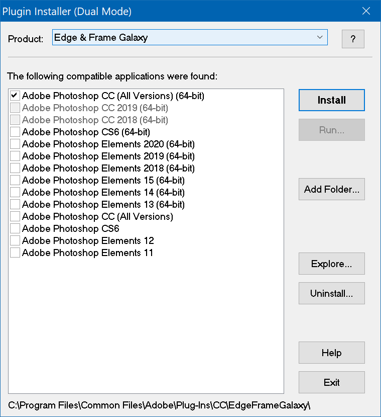 If you install a new version of Photoshop (Elements) and Edge & Frame Galaxy is already installed, you do not need to run the full Edge & Frame Galaxy installation again. You can run Plugin Installer from the Start menu and use it to install Edge & Frame Galaxy into the newly installed version of Photoshop Elements.